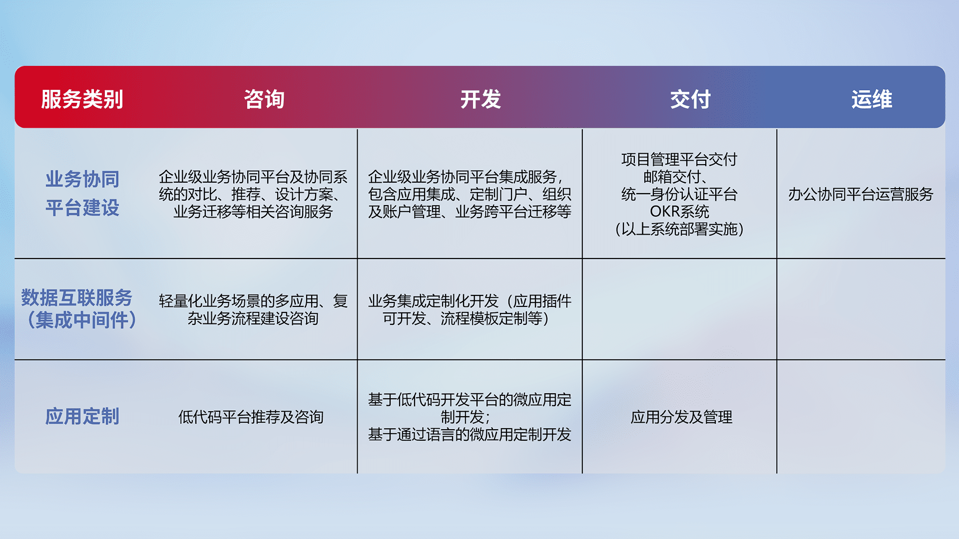 针对钉钉、、企微、、IDaas等平台级产品提供产品的规划、、、、方案、、交付、、定制化开发等服务,,,实现如统一协同办公、、、、智能客户服务、、、混合会议管理、、、、智能数据查询、、、等业务场景,,,,实现数字化转型。。